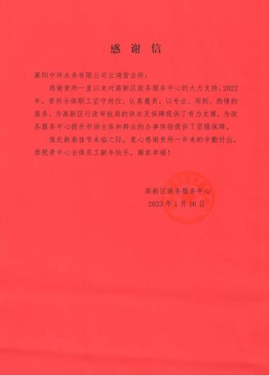 1月20日,襄陽(yáng)中環(huán)水務(wù)有限公司云灣營(yíng)業(yè)所收到來(lái)自高新區(qū)政務(wù)服務(wù)中心的感謝信,信中對(duì)云灣營(yíng)業(yè)所2022年展現(xiàn)出的責(zé)任擔(dān)當(dāng),以及沖鋒在前、聞令而動(dòng)的優(yōu)質(zhì)供水服務(wù)給予充分肯定與高度認(rèn)可。