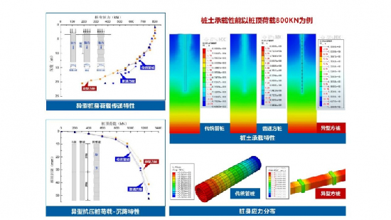 當(dāng)樁頂荷載為800kN時(shí),500mm傳統(tǒng)管樁樁底反力約為450kN,450mm普通方樁樁底反力約為380kN,而異型方樁的樁底反力約為180kN,由此可見,異型方樁在樁身軸力衰減方面優(yōu)勢(shì)也相當(dāng)明顯。